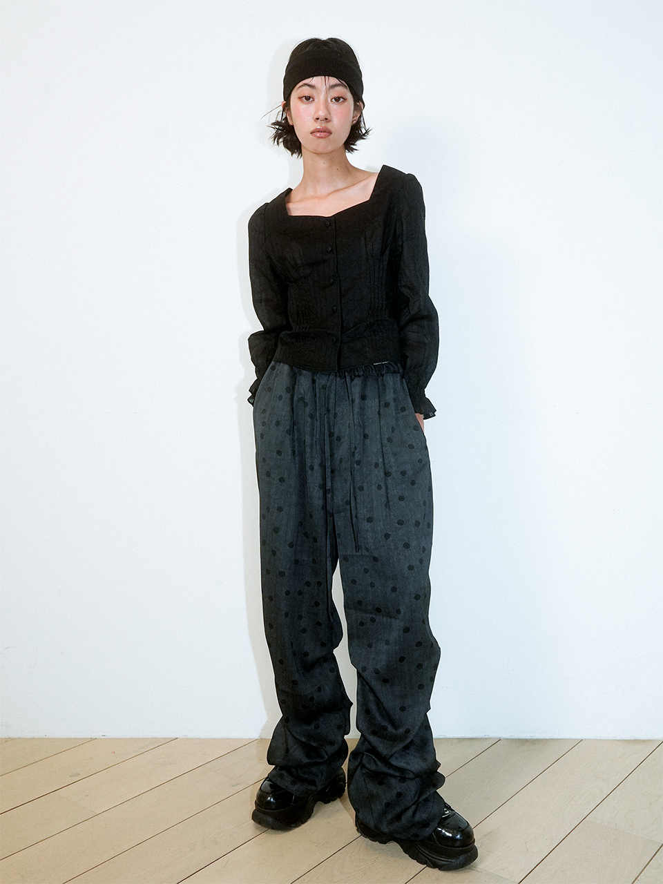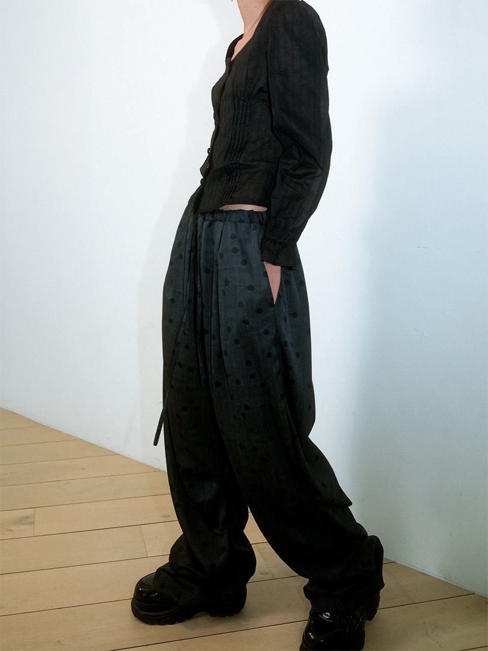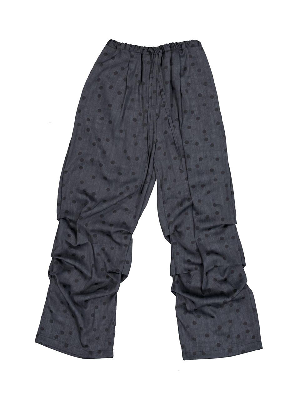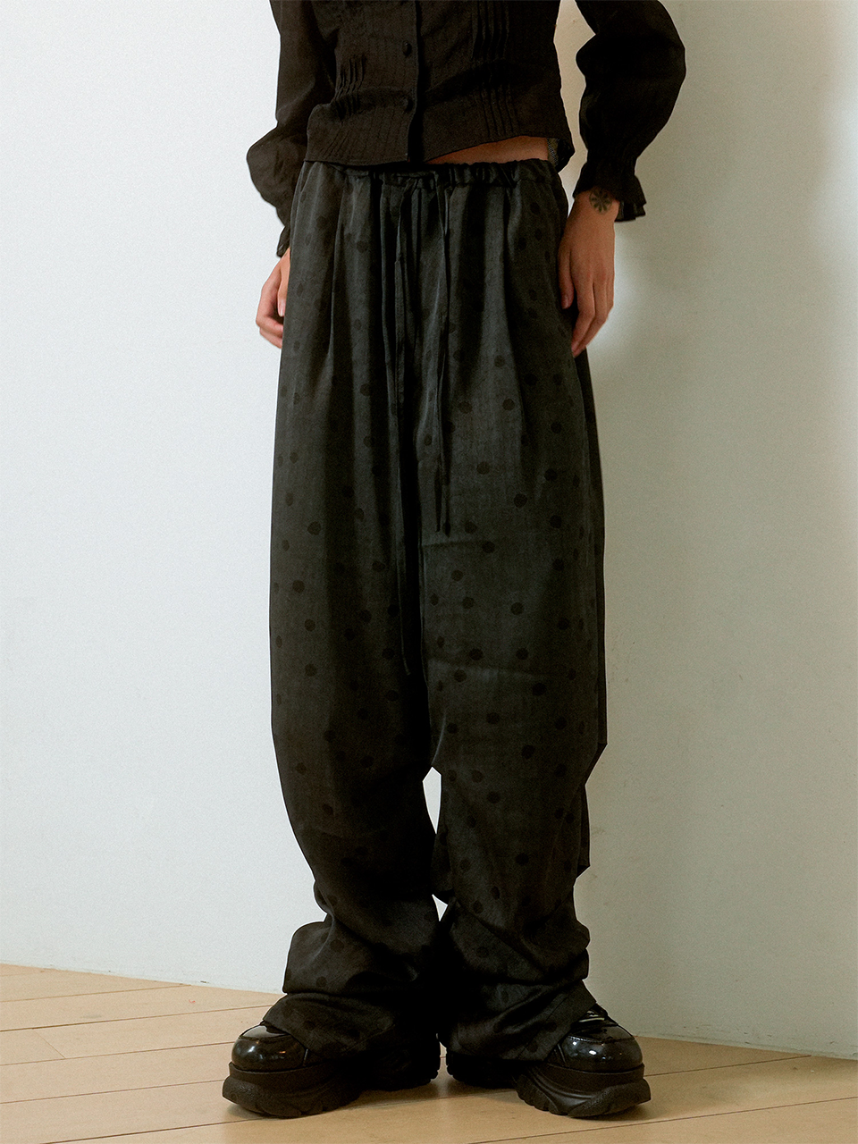 CRUMPLED PAGE WIDE-STRING POLKA DOT PANTS (BLACK)