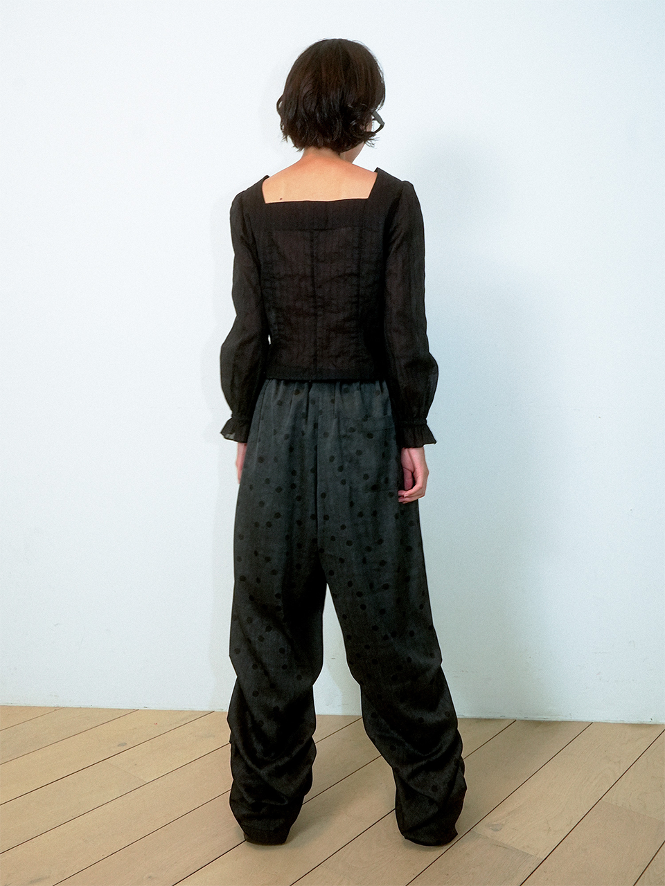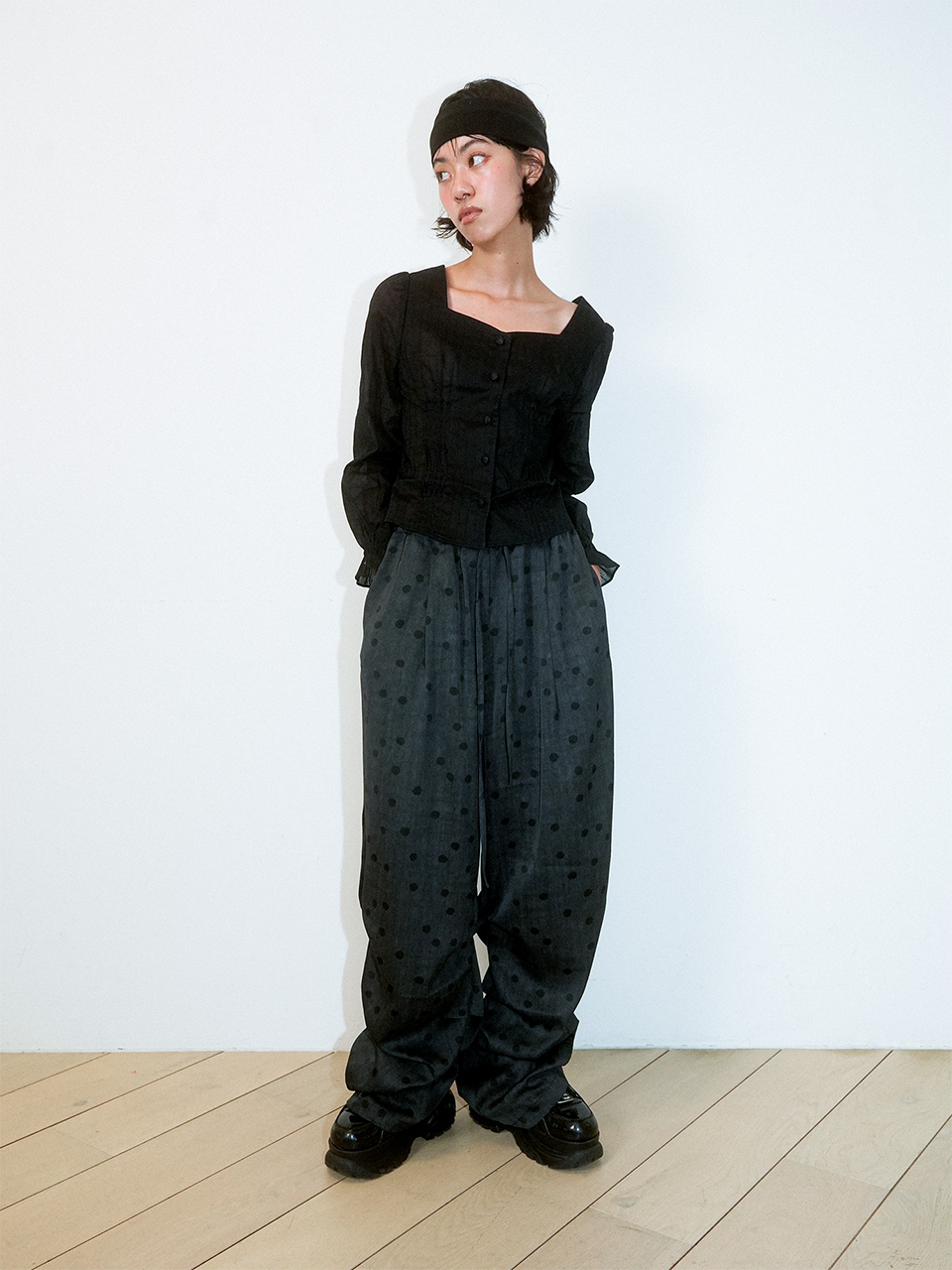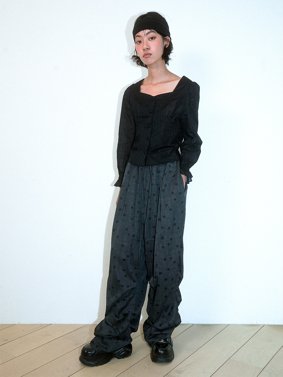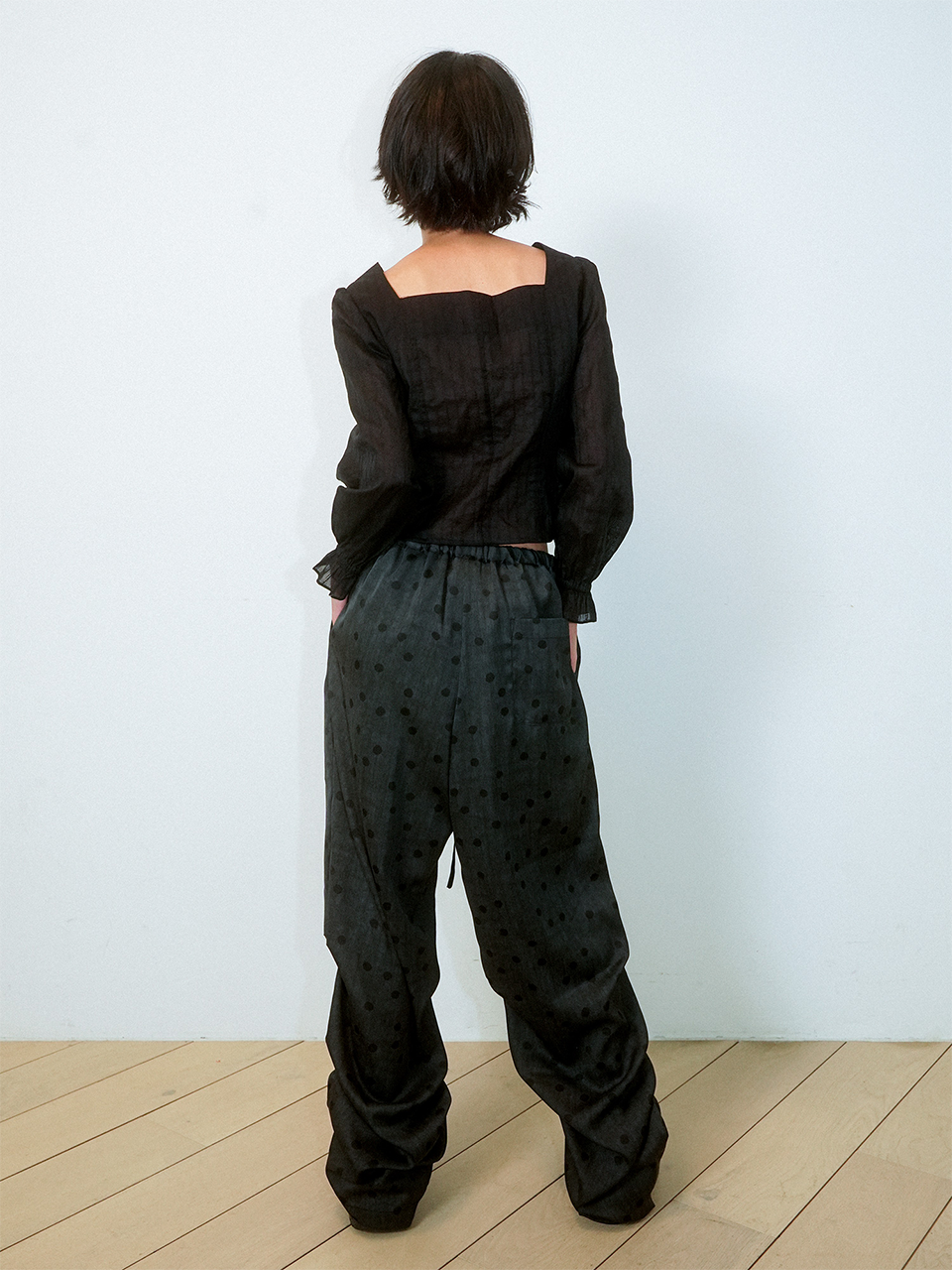 CRUMPLED PAGE WIDE-STRING POLKA DOT PANTS (BLACK)
