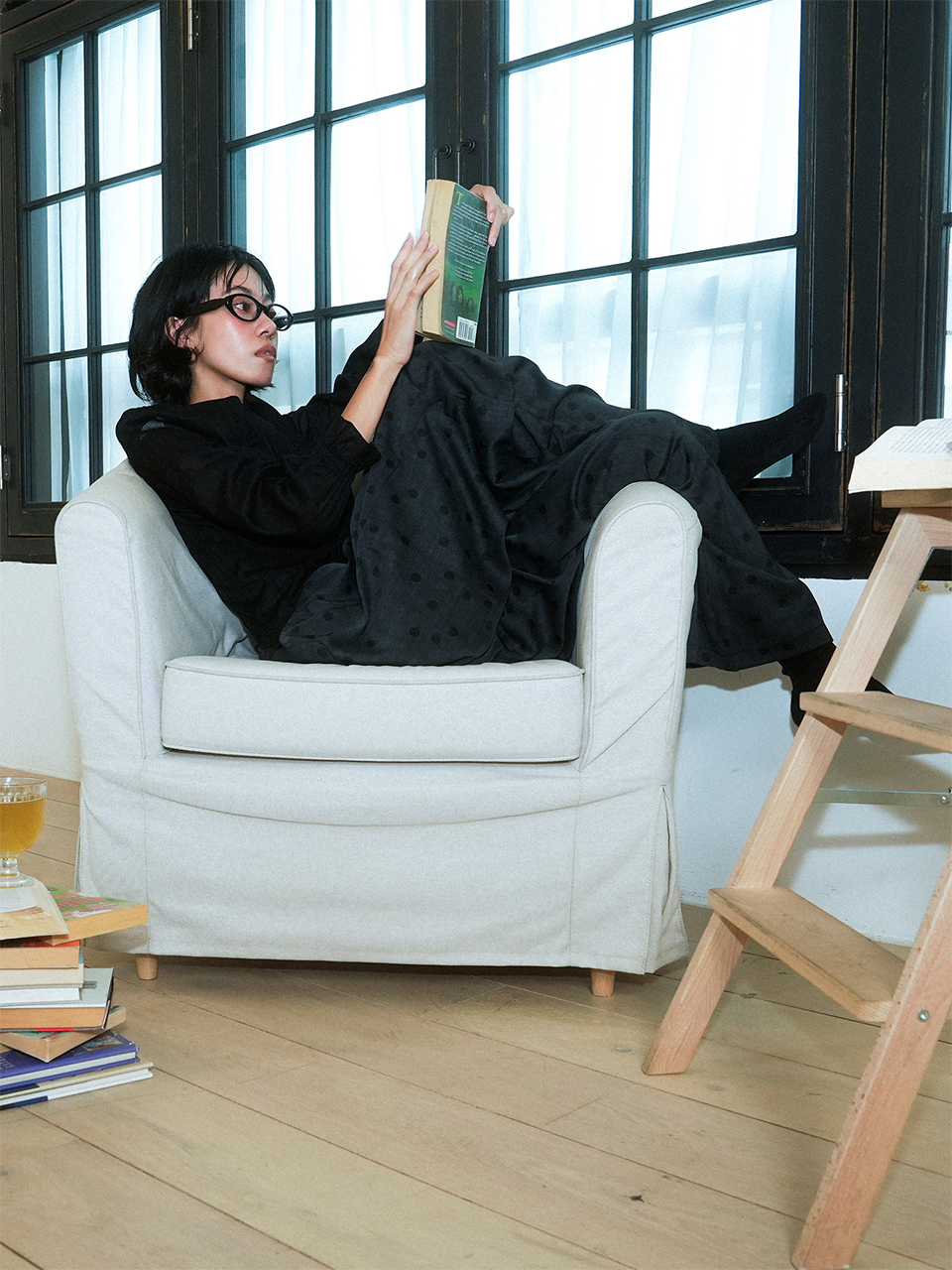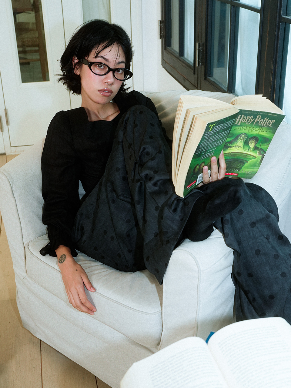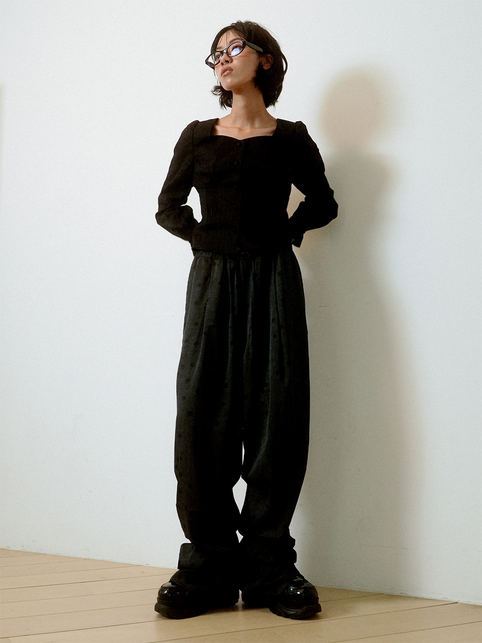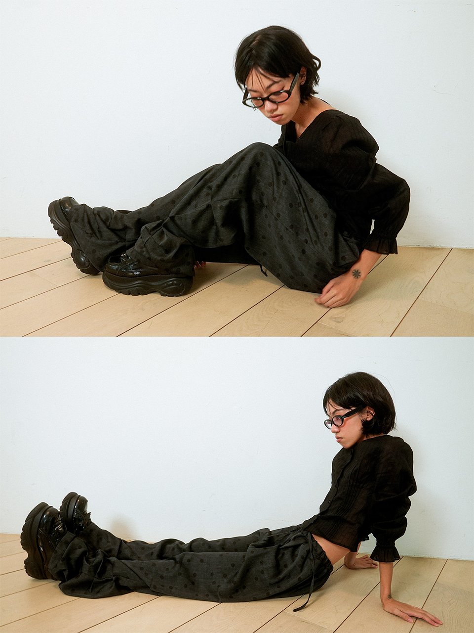 CRUMPLED PAGE WIDE-STRING POLKA DOT PANTS (BLACK)
